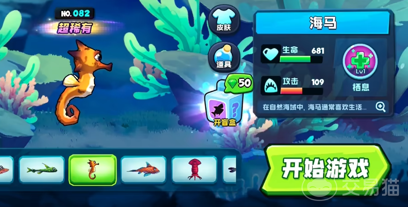 海马:它也同样是属于属性不突出的鱼类。只有681的生命对比同级别的鱼类还稍微有一点点优势,不过它的技能也是续航型技能,而且没有CD属于被动就能触发,只要在需要回血时跑到海底进行七夕,就能够持续获得生命恢复,经过实测恢复的效率还是十分不错的。只要避开那些有意针对你的敌人,那么就可以一直苟到生存赛的最后。