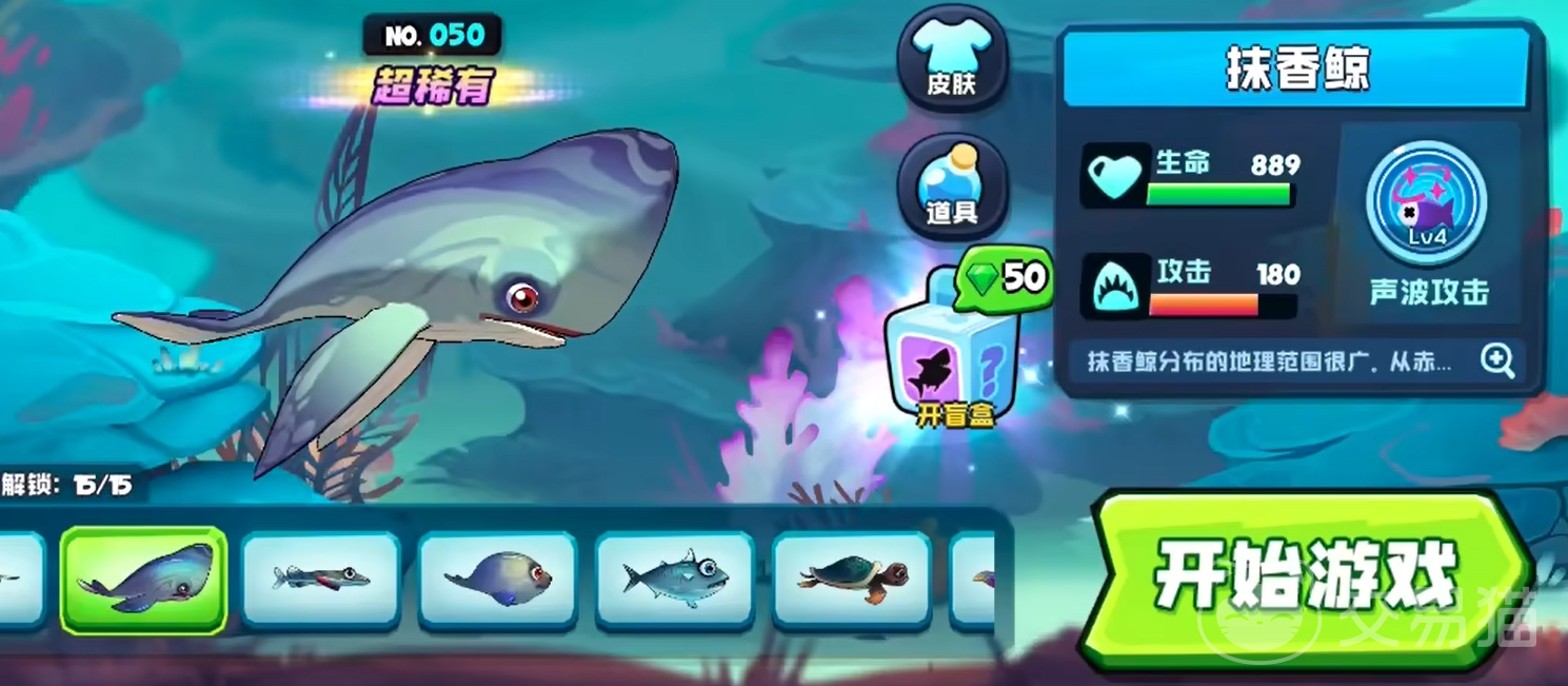 抹香鲸:它是一只典型的大型鱼类,虽然更大的基础体型可能会导致在与其他鱼类争斗时更容易被咬到,但相对的它的基础属性是比一般的鱼要高出很多的,889的血量和180的攻击都足以让它在攻防两端形成天大的优势,而且它的技能是少见的间距控制与伤害的技能,一手声波攻击可以对前方敌人造成伤害和眩晕,就是冷却时间稍长。