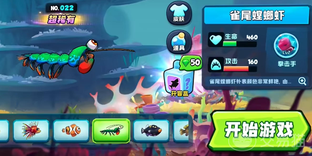 雀尾螳螂虾:它有着460的生命和160的攻击,虽然血量不算多,但这是一个偏向于进攻的鱼类,160的攻击就足以看出它在进攻方面的优势,此外他的技能拳击手还能增加额外30%的攻击力,随着等级的提升,这个攻击力的增幅还会进一步增加,而且这招还能帮助它增大击退的范围,所以非常适合于游斗,可以使用边打边撤的套路来压制对手。