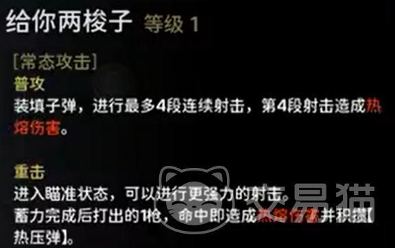 炽霞作为共鸣者之一,其主要使用的武器是手枪,而共鸣属性以热熔为主,它是天宫成员当中必不可缺的一个,而且可以画热情性格为炸弹,对敌人发起连环总攻,而他的炸弹也会像他的热情一样经久不息,接下来详细介绍一下他的民宿异能,其常用的攻击状态是“给你两梭子”,一般情况下普攻模式可以装有四发连环子弹,完成四段连续射击,而第四段设计则可以造成高强度的热熔伤害,而进入重击模式则可以以完成高效瞄准状态进行更强有力的射击,蓄力打击后命中目标即可遭受更严重的热熔伤害,并形成热压弹,除了这2点之外,空中攻击和闪避反击都是它的优势之处所在,但是空中攻击会消耗玩家一定的耐力,却能够实现高效连环射击,整体的伤害指数非常高,而使用闪避反击成功后则要在一段时间内使用普攻,所以玩家需要注意在发动攻击时要进行精确了解。