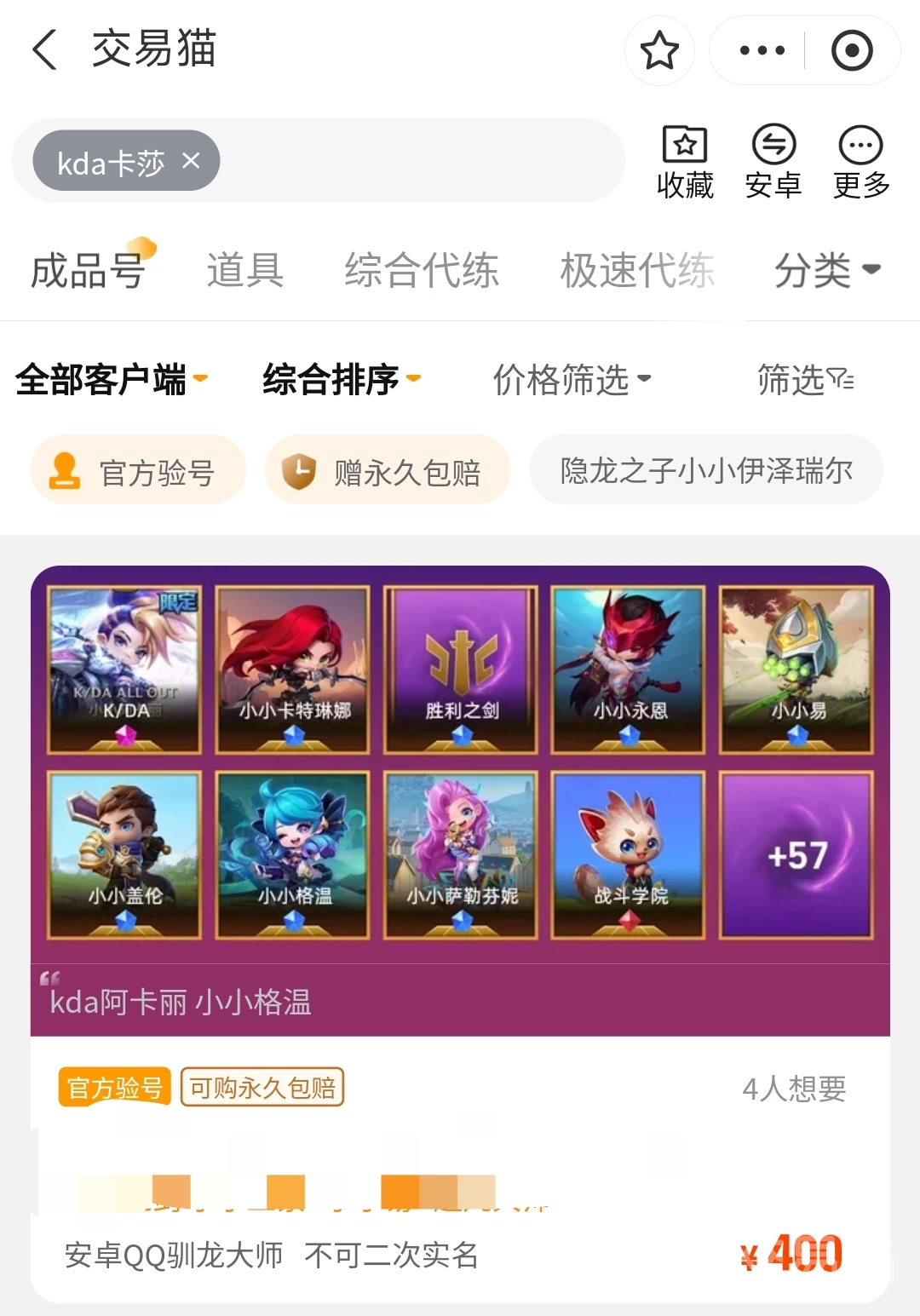 因为交易猫平台的知名度很高,吸引了大量用户,可以说是行业内用户群体最庞大的了。而且绝大部分用户都是活跃的,这里无时无刻都有订单成交。对于新手玩家来说,在这个平台查找目标商品可能会感到困惑,但交易猫的操作流程非常简单:在首页搜索游戏名,选择对应账号类型(如成品号、新手号),然后在筛选框中输入目标账号关键词,比如“皮肤神龙尊者”、“KDA卡莎”,最终显示出来的账号都符合要求。接着只需对比一下各个账号之间的价值,选择最合适的进行下单即可。