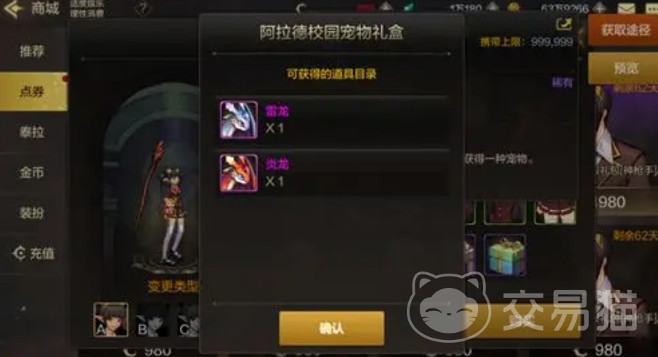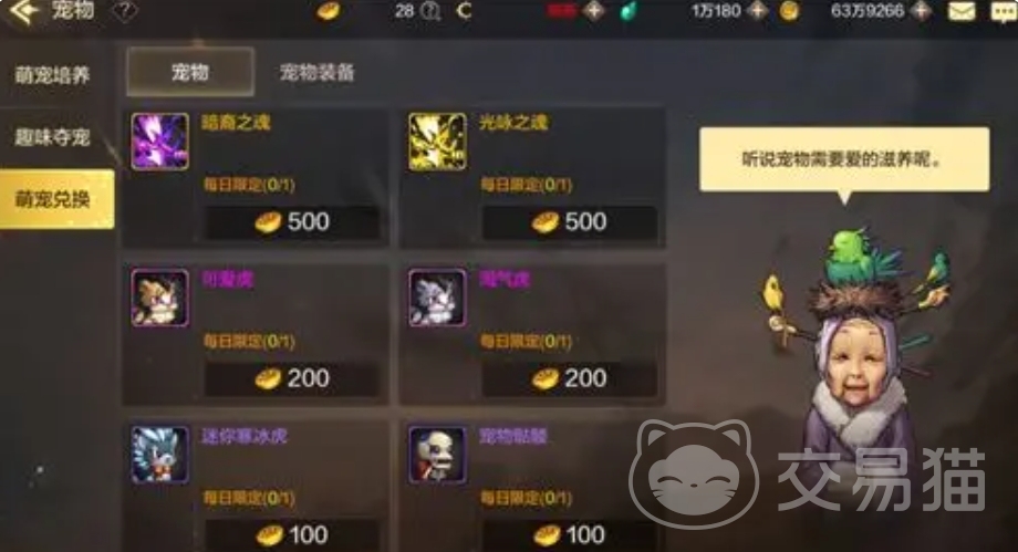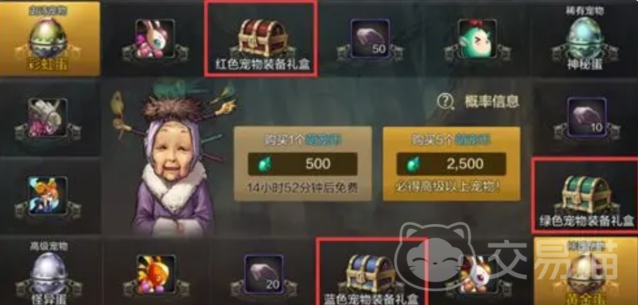 此外就是通过兑换来获取,在老奶奶那边,不仅可以兑换相应的宠物,还可以兑换宠物的一些装备。一天一刷新,并且每天兑换数量有限制,绝大多数的武器装备只能每天兑换一个。只不过价格方面相比相比宠物动辄500个币,最高级别稀有度的装备也不过所需350个币。