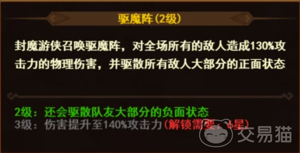 她的另一技能“驱魔阵”则是一个带有驱散效果的范围群伤,使用后能够在对敌方全体造成大量物理伤害的同时驱散他们大部分的正面状态。值得注意的是,驱魔阵的等级达到二级以后,使用时还可以驱散友方的负面状态。因此无论是用于这个技能兼具伤害和驱散两大作用,对敌我双方都有着很大的影响。玩家们能够掌握好这个技能的使用时机的话,就可以成功扭转战局,倾斜胜利的天平。