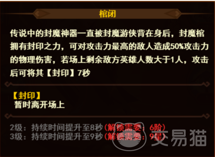 封魔游侠的大招叫做“棺闭”,虽然输出不高,但是一个针对性很强的技能。这个技能能够对场上攻击力最高的敌人造成50%攻击力的物理伤害,并在场上剩余敌人不少于一名的情况下上好一个长达七秒的“封印”Buff。这个Buff可以使得敌人强制退场,并且随着技能等级的逐步提高,持续的时间会越来越长。该技能可以让场上快速形成一种多打少的优势局面,自动锁最高攻击力的敌人这个特点也能精准地ban掉对面最强的战力,可以说是最强的单体限制技能。