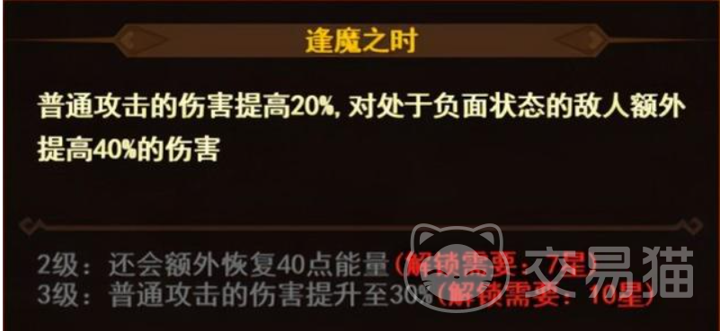 在此之外,封魔猎人还有一个堪称变态的技能,那就是“狩魔爪”。这个技能可以让她偷取任意一个敌方英雄攻击力的35%,并持续六秒。当这个技能达到满级后,还可以使敌人能量的恢复速度下降60%。这个技能建议用在敌方攻击力较高的英雄上,这样不仅能使得封魔猎人获得更好的攻击力收益,还能限制对方强力角色的能量积攒,导致对面无法快速地放出大招。在一招就可能决定胜负的战局之中,可不能小看它能起到的关键性作用哦~