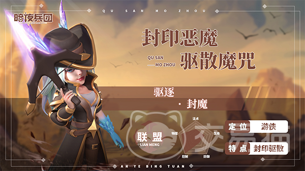 封魔游侠是一名穿着黑色劲装,有着飘逸白色长发的冷艳女子。她的阵营归属是联盟,有着控制、敏捷的战场定位和封印驱散的输出特点,具有很强的个人特色。她的技能“驱魔之时”偏向增益类,可以使其普通攻击的伤害得到百分比提高。当她所面对的敌人身上有debuff时,她的伤害更会提升到40%之高。在此之外,将这个技能升到二级,封魔猎人就能在使用技能的同时恢复40点大招能量。该技能既让她有着不低的普攻伤害,又能加快其大招的充能,配合上能够回能的辅助英雄,可以让她有着极其优越的技能循环和极高的输出频率。