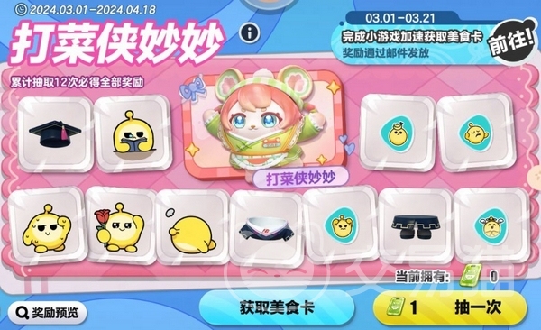 以上就是对于蛋仔派对打菜侠妙妙怎么获得的详细说明,简单来说就是在活动持续期间内上线去做任务,完成任务就可以抽卡,抽12次就能将奖励全部拿到手,时间充足,奖励丰厚。不仅有免费皮肤,还有毕业套装和8款表情包,一定要全部拿下!