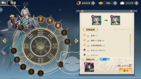 升星顾名思义则是提升人物的星级,每升1星都会解锁新的属性增益,以图中的卢植为例,4星可以解锁物攻法攻提升5%,5星血量提升5%。最多能升到12星,提升显著升星需要同角色碎片或者万能碎片,同时也消耗较多的铜币。升星对角色加成是巨大的,但消耗也比较多。