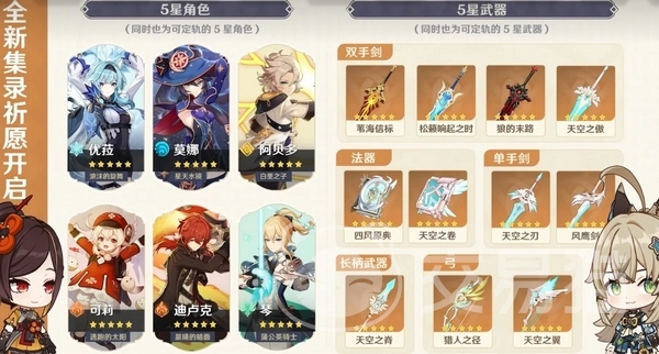 这次可以定轨的5星角色包含优菈、莫娜、阿贝多、可莉、迪卢克,5星武器包含双手剑、单手剑、法器武器等11把。伴随这次混池一同而来的还有5星的限定UP角色“千织”,并复刻荒泷、那维莱特、万叶等角色,此外还会有新的5星单手剑和4星长柄武器。
