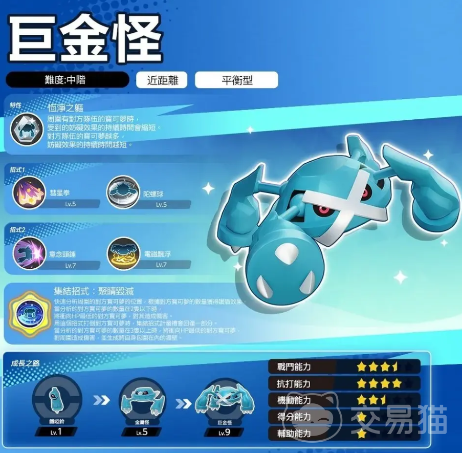 宝可梦大集结巨金怪我们今天就分享到这了,其实从它的技能设定以及玩法表现来看,是个实打实的后期战士型c位。在拥有资源之后的巨金怪在中后期可谓人挡杀人,但是前中期也是十分依赖队友的有效配合。只要发育起来的巨金怪无论是在对线、团战还是追击敌方宝可梦时,巨金怪都能成为我们致胜的关键所在。