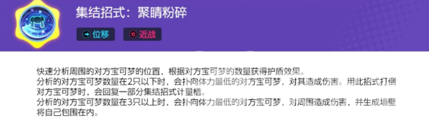 在团战中巨金怪的大招聚睛毁灭能可以自动追踪周围宝可梦,并根据敌方人数来获得一定数额的护盾。当分析的敌方宝人数数量在两个以内的时候,而巨金怪会冲向HP最低的敌方宝可梦并造成伤害,这使得它在追击单个目标时非常有效。