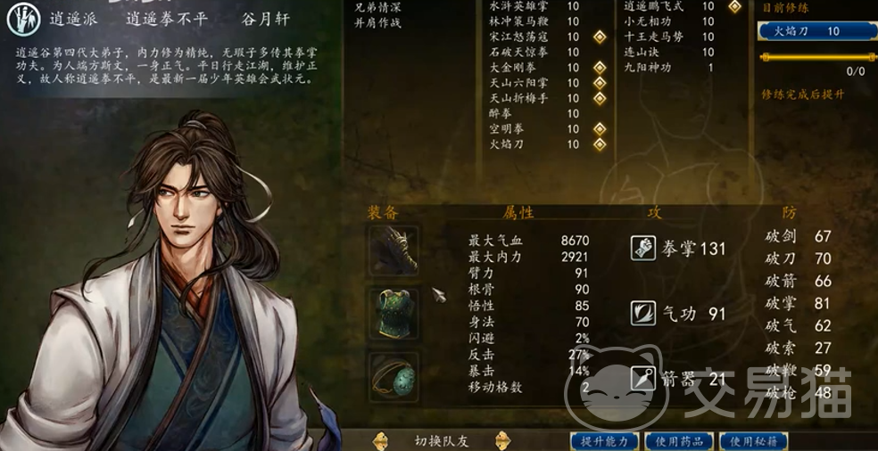 首先在队伍的人员安排上,小编建议大家选择大师兄,荆棘,塔娅和江瑜。大师兄只要有武学火焰刀和内功九阳神功就行,荆棘作为主要的输出角色,选择日月神功佩戴或者雁行式。塔娅只要有神曲但丁和道生初始配备就够打了,起辅助作用。江瑜则主要用来抓人,防止敌人逃跑。出场角色的顺序大家可以设置成荆棘,江瑜,大师兄和塔娅。
