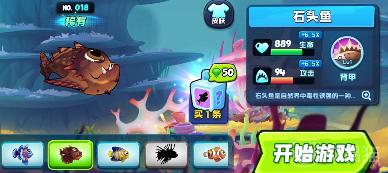 石头鱼——初始面板生命值有889点,94点攻击力,技能是【背甲】可以对攻击自己的敌方造成一定的伤害。