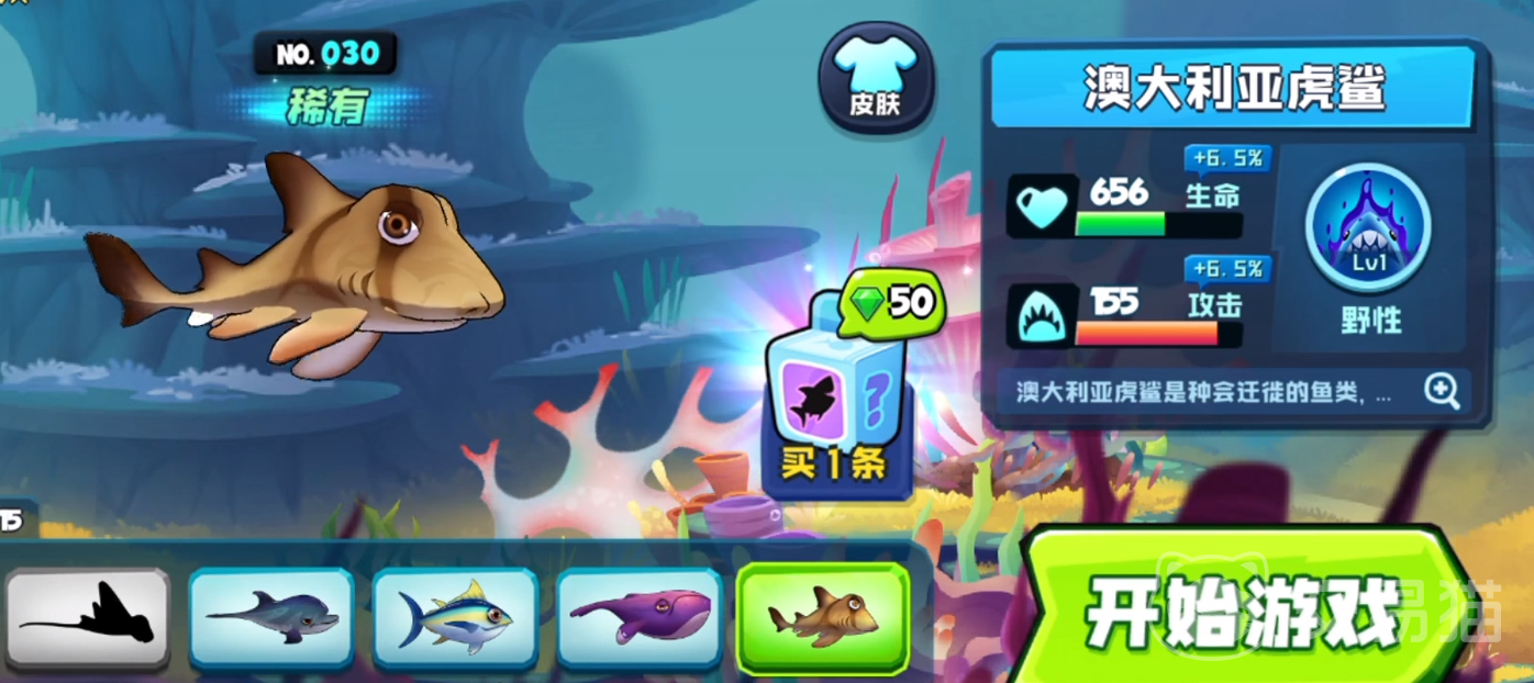 澳大利亚虎鲨——生命值是656点,攻击力是155点,技能【野性】可以增加一定的伤害。