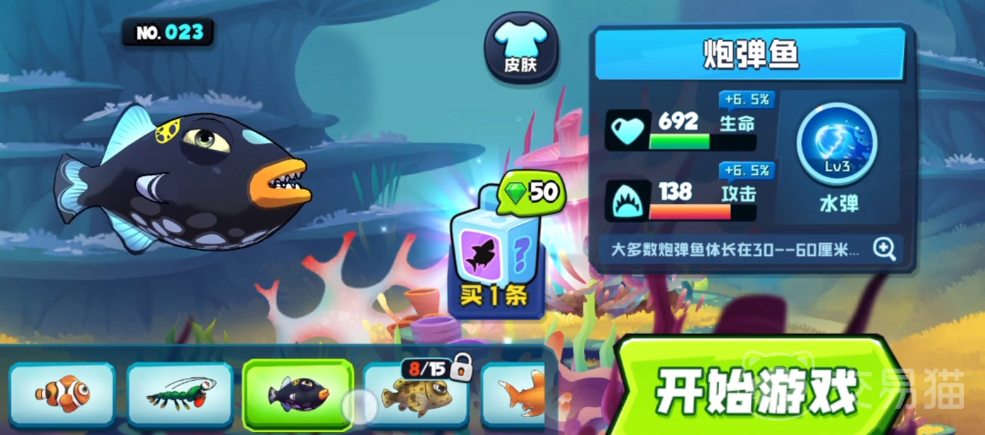 炮弹鱼——初始面板692点生命值,138点攻击力,技能【水弹】可以朝着前方的敌人进行水弹攻击并造成击退效果。