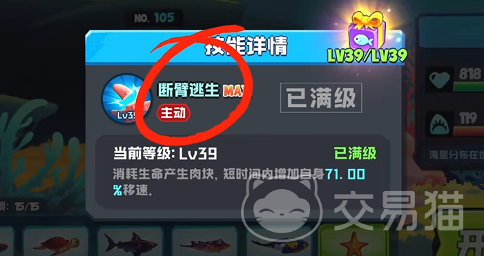 如果周围有鱼类的碎片时,大家使用海星会更加的容易抢到经验值!同时,海星还有一个十分特殊的技能【断臂逃生】,这个技能的强度就在于,当大家被追捕的时候,释放技能后,自身的速度会增加,但是时以消耗自身生命值来进行产生的!