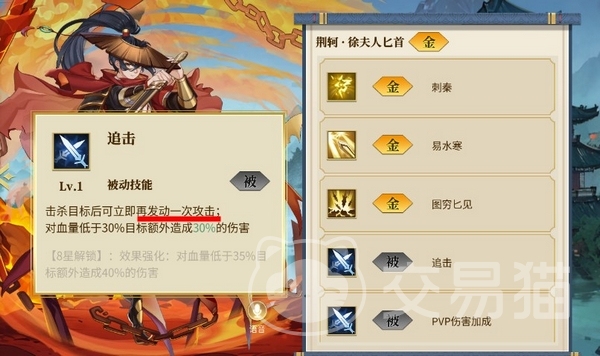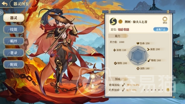 小技能可以瞄准敌方血量最少的后排攻击,同时标记对方,被标记的单位受到徐夫人匕首伤害和其他金系的伤害提升。必杀“图穷匕见”同样是瞄准后排血量最低的单位造成高额的物伤,同时将目标30%的物攻吸收为自己所用。其次她的被动还可以在完成击杀之后再次攻击。这几种特性让徐夫人匕首这只器灵的定位非常清晰,主要用于敌方有那种高攻脆皮后排,可以尽快清除威胁。