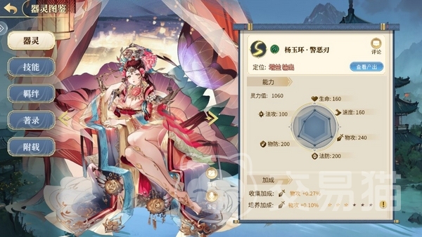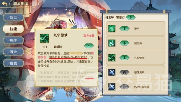 警恶刃对应的是杨玉环,也是SSR并且是游戏初期大家可以免费领到的器灵,她的定位偏增益输出。普通单体物攻同时提高自的攻击力,且可以叠加。小技能单体物攻伤害如果目标的武功比自己低则追加一次普攻。必杀强力单体物攻并降低目标所在列的武功,同时给自己提速,重置小技能的冷却。