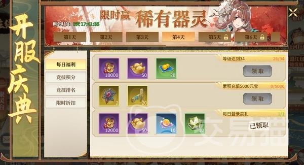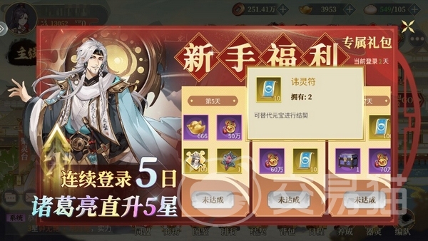 每天在线一段时间后点击屏幕上方的“在线礼包”就可以领到一些奖励,可以多次领取,直到这个图标消失。然后是“直升5星”活动,开服连续5天登录可以领到包括SSR器灵诸葛亮、抽卡券在内的很多奖励。