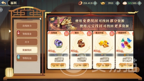 有时候因为一些现实中的事情忙不开,导致不能参与游戏的活动,游戏里也提供了“资源找回”,可以使用铜钱找回部分丢失的资源,使用元宝的话则可以找回剩余的部分。