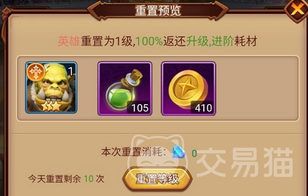 每天玩家有10次可以免费重置英雄的机会,超过这个次数就需要花费钻石了。此外,部分玩家可能会发现有的英雄有回退限制,这里是需要将vip等级提升到9级,这时候重置6星以下的英雄时,不仅能回退到初始的星级还会返还全部的英雄材料。