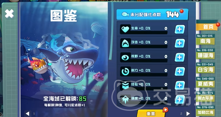在这款游戏当中,首先要给大家详细介绍的是第一个玩法,就是游戏中的【加点】玩法,当玩家们在游戏中解锁了一些鱼类的时候,大家就可以获得一些解锁相对应的礼物和一个点数!这些点数在游戏中起到了非常关键的作用,首先就是推荐大家优先添加【经验】点数,这个经验点数非常的好理解,经验点数数值越高的话,那么大家在第一阶段,相对于同等级一起发育的鱼类来说,就有更好的发育空间,大家更快的提升的等级的话,对于后期的鱼类解锁也会更加的便捷!