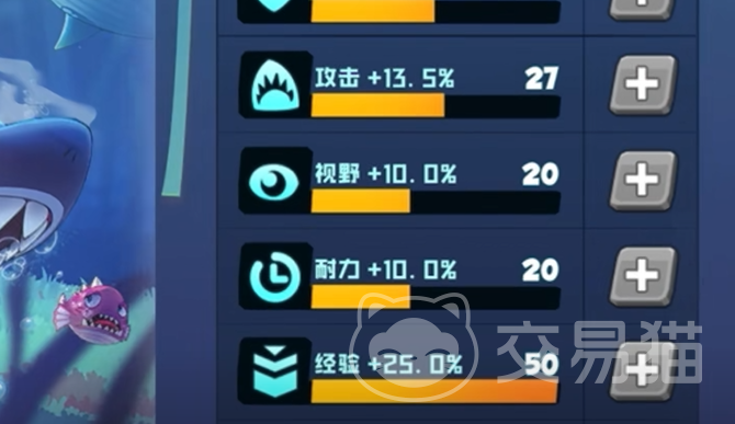 第二个加点就是大家十分看中的【攻击】点数加点,这个攻击点数非常的重要,攻击点数从第一阶段是非常的重要的,大家初始阶段给予加点50点的话,是可以在1到30级的时候,有一个非常直观的感受的,攻击点数高的话,大家在和同等级敌人进行撕咬的时候,也会有更高的优势,而且虽然游戏中的鱼类比较多,但是目前版本而言的话,大型鱼类其实血量都比较低,如果在攻击方面也实质性的压制的话,那么是很轻松的就可以达到击杀的效果的!