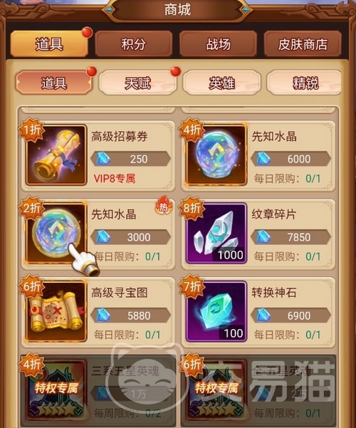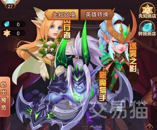 而攒着的钻石则可以用来兑换“先知水晶”,去抽“先知召唤”卡池,每天在商城里会都有不同折扣的限购“先知水晶”,有钻石的情况下推荐都买了。先知召唤可以用来抽取那些精英级别的初始5星英雄,例如恶魔猎手、迷雾之影等等。