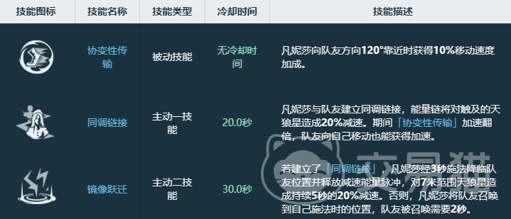 凡妮莎的被动技能“协变性传输”为她提供了在战场上快速移动的能力。当她向队友方向移动时,可以获得移动速度的加成,这使得她在支援队友或撤退时更加灵活。