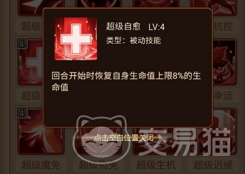 如果是坦克类的英雄,以“熊猫酒仙”为例,他可以分摊队友受到的伤害,可以驱散自己的负面效果,同时普攻概率降低对方防御,受到攻击必定反击。纹章可以选择“超级自愈”,每回合都可以回血,或是根据敌人的输出构成来选择超级魔免或者超级物免。