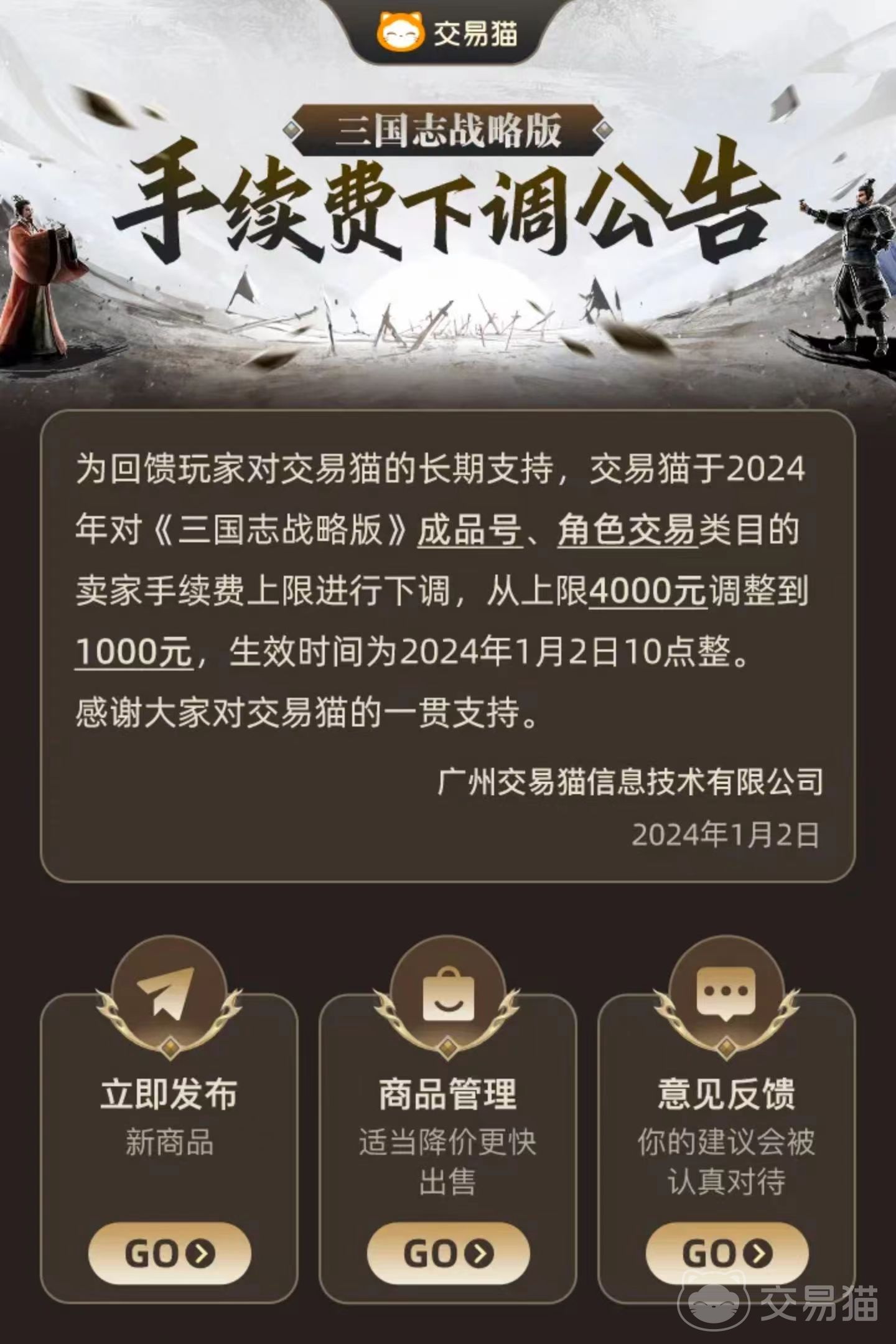 三国志战略版这款游戏属于是在交易猫上的当家花旦,交易量非常大的同时,也是玩家们最喜欢的游戏。所以交易猫为了回馈玩家们的支持,下调了交易猫上交易三国志战略版的手续费,也算是给大家的一些福利,更是希望我们交易猫这个平台帮助到大家,更好的服务玩家们,也更愿意选择交易猫去交易。
