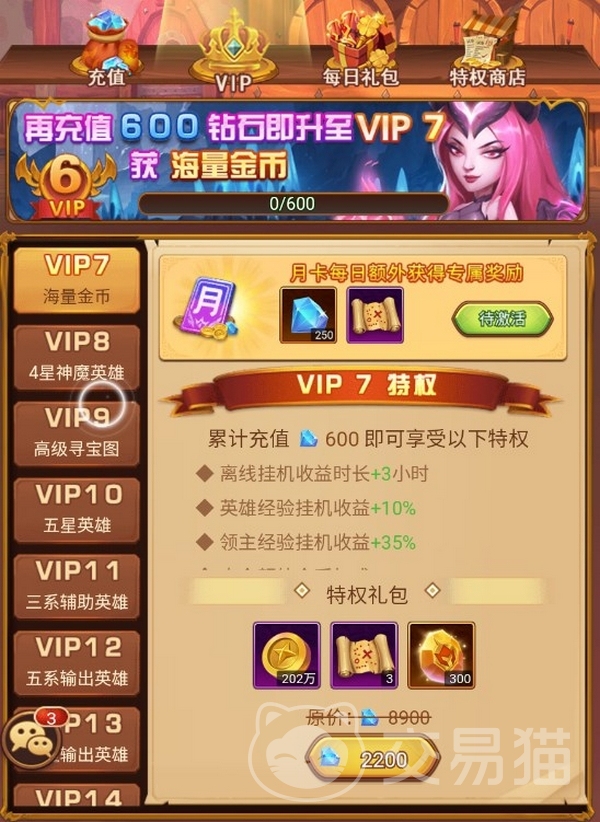 对于这款游戏中的段位有不同的理解,如果是PVE段位,那么主要是指VIP等级,在游戏主城界面右上角找到特权,进入后可以看到一些充值选项,第二项VIP便是玩家的特权段位。