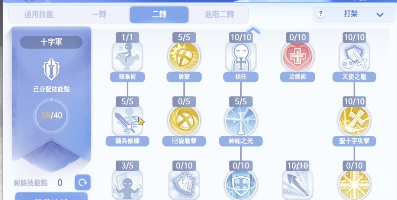 当玩家职业进阶以后,就是十字军的加点了。首先是点骑术和盾击。这两个技能都能有效增加十字军的输出能力。然后就是加坦度的技能了,分别是神佑之光和天使之躯。另外,玩家也可以将庇护点满,这个对十字军的生存能力有着很大的提升。