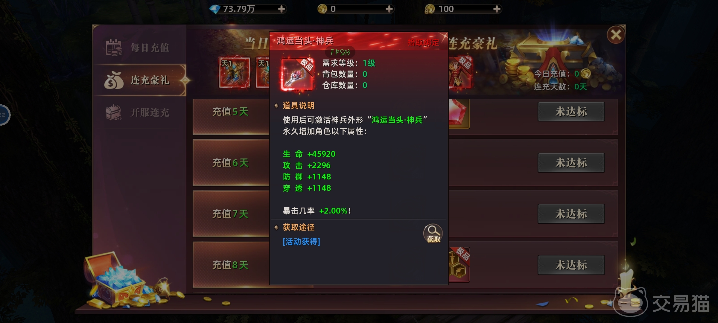 首先是最简单的方式——氪金。《魔法战线》刚刚进行公测,也是为大家准备了非常丰厚的福利好回馈。玩家炼虚氪金七天就可以获得绝世神武【鸿运当头】。鸿运当头会为大家带来4万生命值,2000攻击,1100防御和1100的穿透,让大家的战力大大增强。