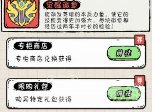 那么觉醒徽章到底能够发挥什么样的作用呢,首先是可以将英雄的潜能给激发出来,将他们的技能进行强化,这样就可以将角色的战斗力增强了,有两种方式可以获得觉醒徽章,一种是在专柜商店里面去兑换,另外一个方法就是购买特定的礼包才能得到觉醒徽章。