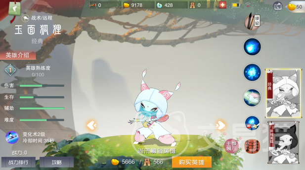 玉面狐狸的一技能叫做冥火弹,这个技能的冷却是很快的,只不过是非指定性的一种技能,伤害只能算作中等,不过因为有被动技能的重置,所以她的伤害也很漂亮,在攒桃子的时候记得绕着团队去游走,不要进入战斗的中心。
