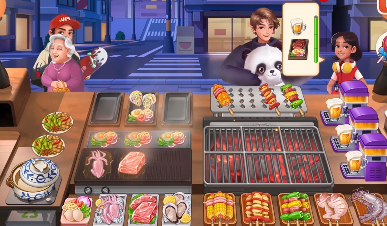 这算是比较难的一个店铺挑战,主要问题之一还是在于配菜以及其他小料方面较少,而且还有铁板烧的加入。需要完全照顾食材的烧烤情况以及完成度,几乎每一个烤串都需要照顾到他们的烧烤程度,而且数量一多就容易帮不过来,非常容易烤糊,难度不小。