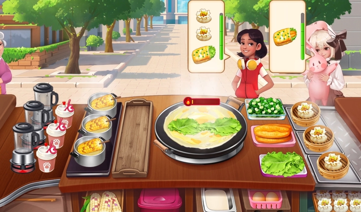 那么第一个就是我们的煎饼店售卖煎饼果子在内的一系列早餐,以煎饼果子为主,可以按照顾客的需求来放油条,生菜,香菜等等配料,同时还会售卖包括煮玉米以及蒸烧麦在内的其他食品,其玩法难点还是在煎饼的制作和搭配,其他的还好。