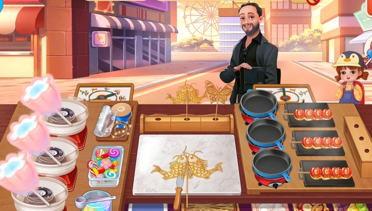 这个店铺其实并不是特别难,毕竟关东煮想煮多久就煮多久,并没有对于食材火候的要求,因此在容错率方面较高。主要的大头还是在旁边的炸豆腐上,只要重点照顾豆腐的成熟以及旁边铜锣烧的成熟即可。