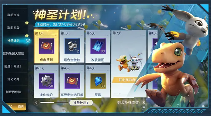 本次的联动是在3月7号开启。联动的主要内容是数码宝贝的第一部。首先联动的第一个活动是神圣计划,这个是一个签到的活动,玩家们在活动期间每一次登录都会获得一些奖励。到第七天的时候玩家们可以获得联动宠物,宠物在亚古兽或者迪路兽进行二选一。
