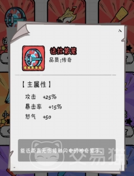 作为红色传奇品质的顶尖装备之一,法拉第笼的主属性方面,能为我们提供25%的攻击加成和15%的暴击率加成,同时还能额外增加50点的怒气。是我们主c启动以及主c伤害方面最推荐的装备,非常好用。