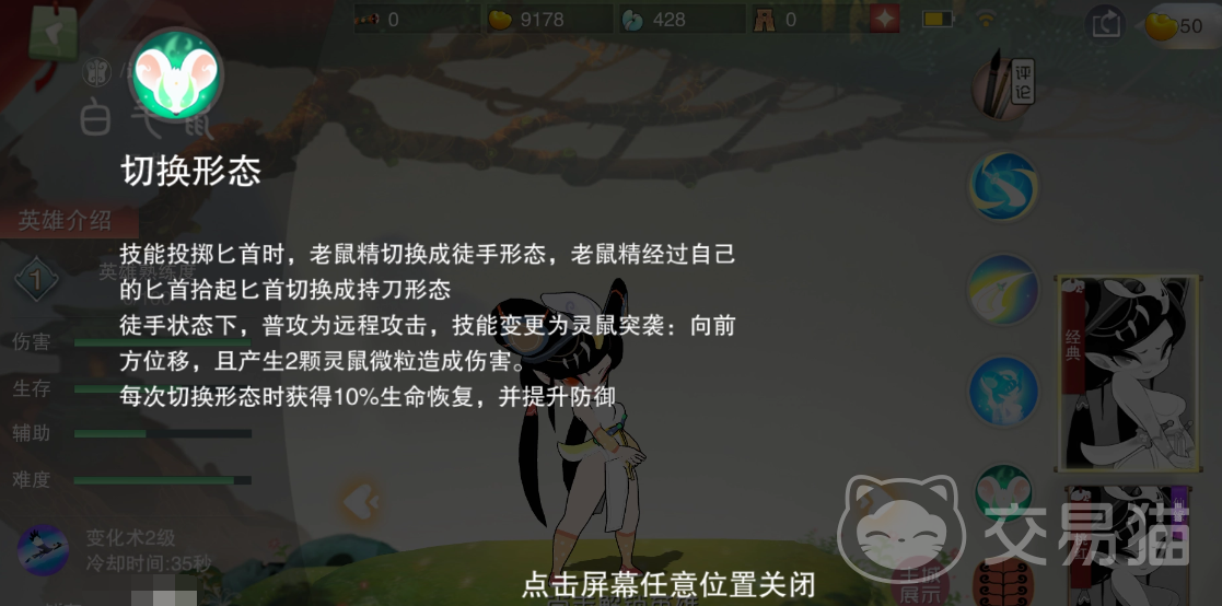 白毛鼠的所有技能都围绕着它的特殊的双形态来展开的,他可以在远程和近战之间转换,在远程形态下,白毛鼠能够进行频繁得技能骚扰,而近战形态下,白毛鼠会化身刺客进行收割。而什么时候切换、什么血量切换则是衡量一个白毛鼠玩的好坏的关键,切换形态不仅仅会让我们的攻击模式发生改变,还会回复10%的hp并产生灵鼠,所以说切换的时机才是关键。