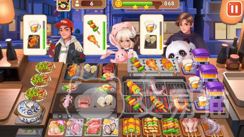除此之外,在开始游戏之前有许多道具可供选择,有些可以帮助小伙伴们将摊位上的菜自动拿给需要的客人,而有些可以使得所有食物都不会烤糊,或者有些可以让所有菜品直接制作而成,小伙伴们在关卡开始之前可以选择自己所需要的道具,除此之外还可以对菜品进行升级,这样可以提高售价,赚取更多的金币。