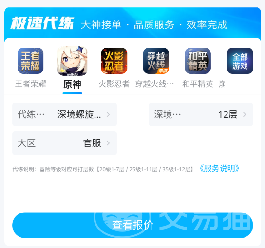 除了可以买到各种类型的账号外,交易猫还支持代练服务,而且针对不同的游戏做了细致的划分,玩家可以设置你想要的套餐,需要达到什么要求,然后查看各种报价,选择你满意的服务直接下单