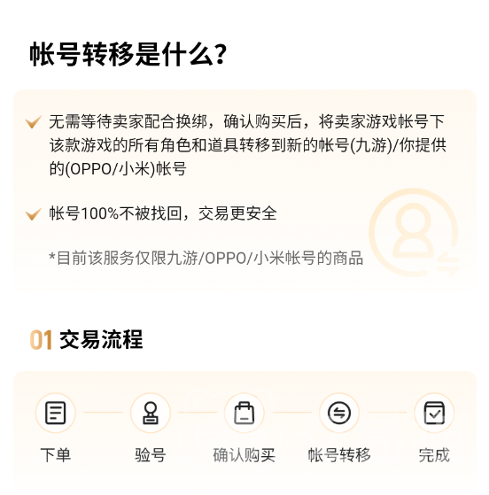 还有账号转移,这也是交易猫APP的特色服务,交易猫与九游等渠道方合作,可以将卖家游戏账号下的所有角色和道具直接转移到买家所提供的新账号上,这样可以保证100%不会被找回,交易也自然更安全。