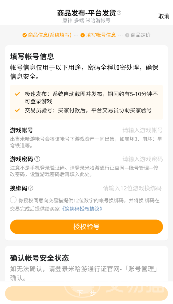 不仅是买号,卖号同样方便,目前交易猫支持原神、和平精英的免费估号,其他游戏也可以通过对比平台内商品来设定价格。针对不同的账号有不同的发布方式,例如官方托管卖号、平台发货等等。玩家要做的就是简单的跟着指引正确填写信息,然后坐等收款。