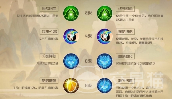 然后究竟是它的天赋,在升级时可以选择天赋加点,2级从脱战回血和强化技能使用回血中选一个,4级是从永久加攻击和提升连招伤害中2选一,6级是降低大招冷却或者增加强化技能的使用次数。8级则加血防或者使用不同强化技时会额外对目标造成对方血量百分比的真实伤害。天赋选好了之后是无法再修改的,所以加点一定要更慎重一点。