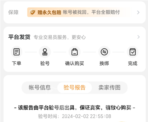 在这个平台当中,是有平台官方进行专业的验号的,也就是说大家准备或者是想要购买的账号,都是经过平台正规检验的,官方对账号检安全性更高,验号之后还有一个验号报告,这也是大家可以仔细查询的,包括账号得到详细信息情况,还能够使用平台的查验功能来验证账号是否合法,避免自己上当受骗,如果觉得账号有问题,也可以第一时间和官方进行联系,及时终止交易,这些功能都将交易的可信度与安全性提升了。