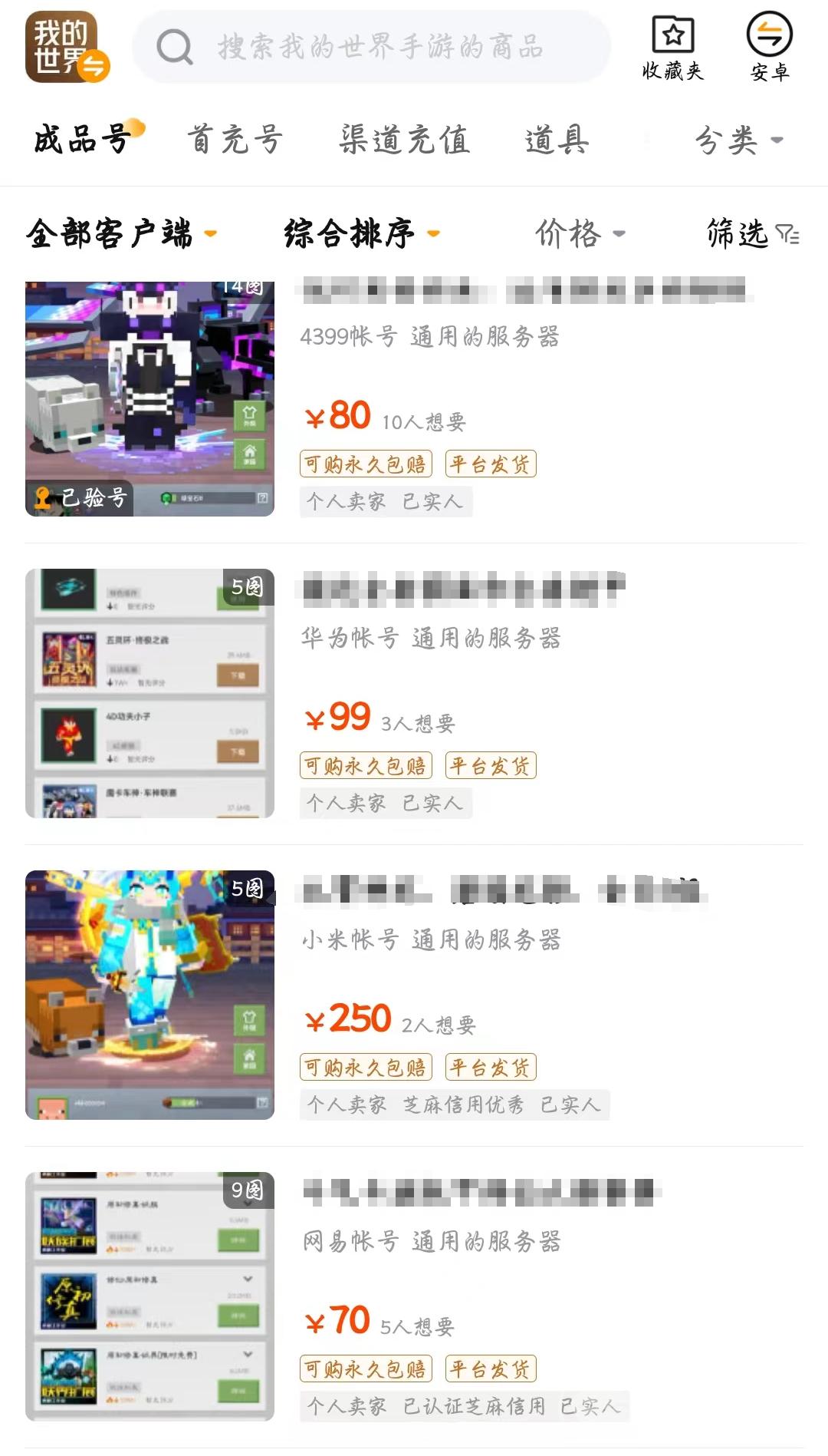 举个例子,网易登录的账号就可以搜索到很多,其中价格100到几百甚至上千不等,大家根据自己目前的零花钱水平去选择就可以了,不管是哪个账号都是能够体验游戏内容的,因为它的创造资源基本上都有,只要学会合理的使用各种创造道具,就可以建造出非常精致的地图。