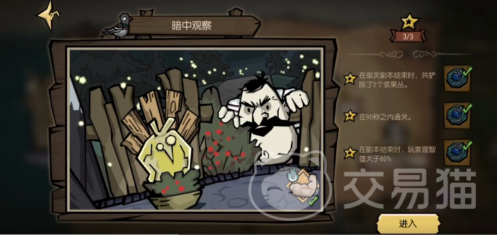 暗中观察是沃尔夫冈的第二个关卡,你需要先满足以下解锁条件:家园繁荣度达到5000、使用特质:飞镖训练击杀10个生物、给沃尔夫冈赠送一次烤土豆、这些条件都不难完成,你可以在家园里种植土豆,烤熟后送给沃尔夫冈。当你解锁了暗中观察后,你可以进入关卡,这个关卡的背景是黑夜,你的san值会不断下降,你需要在黑暗中寻找火鸡神龛,给它献上浆果丛作为贡品。还需要在90秒内完成,同时保持你的san值高于80%。这个关卡的难点在于你需要在黑夜中找到浆果丛和神龛的位置。